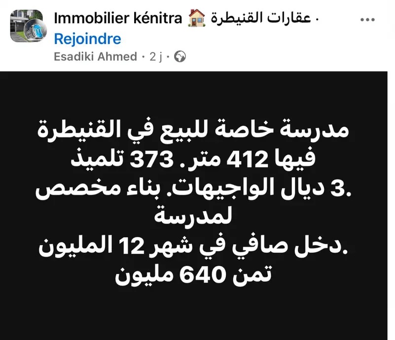 وتضمن نص الإعلان الآتي: "أن هناك مدرسة خاصة للبيع في القنيطرة تبلغ مساحتها 412 مترا. و373 تلميذا وتتوفر على 3 واجهات".