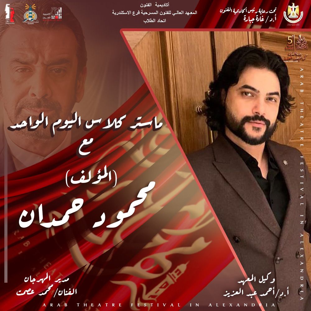 أعلن الفنان محمد عصمت، مدير مهرجان المسرح العربي عن تقديم ماستر كلاس للمؤلف محمود حمدان، علي هامش فعليات الدورة الخامسة من المهرجان، والتي تحمل اسم الفنان كريم عبد العزيز، وهو المهرجان التابع لأكاديمية الفنون والمعهد العالي للفنون المسرحية فرع الإسكندرية، تحت رعاية الدكتور غادة جبارة رئيس أكاديميةالفنون واشراف الدكتور أحمد عبد العزيز وكيل المعهد العالي للفنون المسرحية بالإسكندرية.