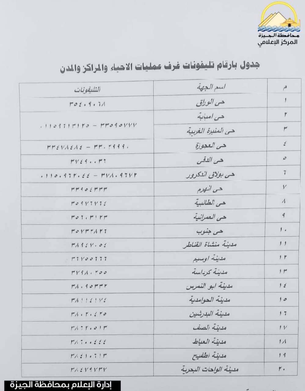 محافظة الجيزة تعلن أرقام غرف العمليات بكل حي ومركز ومدينة