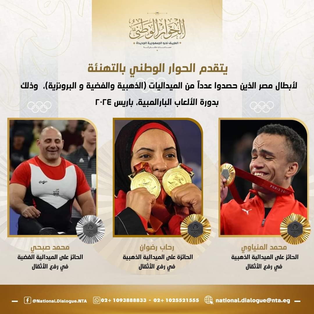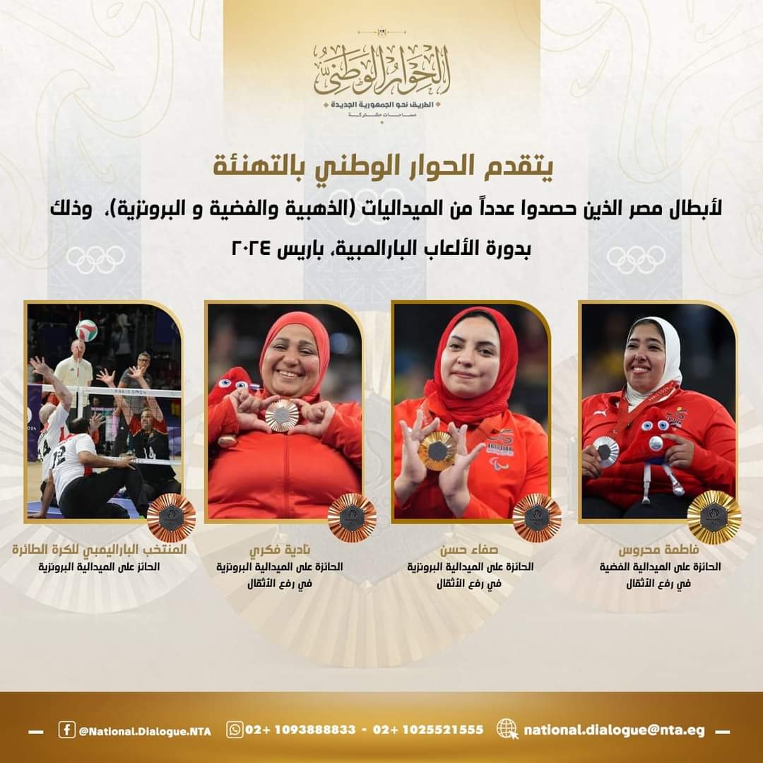 وجه الحوار الوطني بالتهنئة لأبطال مصر الذين حصدوا عدداً من الميداليات (الذهبية والفضية و البرونزية)، وذلك بدورة الألعاب البارالمبية، باريس ٢٠٢٤م.