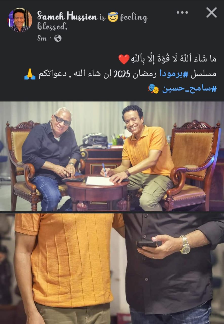 ونشر سامح حسين، عبر حسابه الشخصي علي موقع التواصل الاجتماعي " فيسبوك " صوره مع المنتج أحمد السبكي أثناء توقيعه العقود وعلق .. ماشاء الله ولا قوه الا بالله مسلسل برمودا رمضان ٢٠٢٥ إن شاء الله .. دعواتكم.