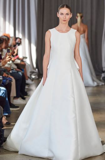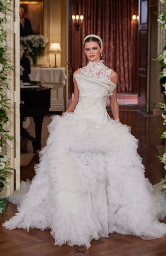 إذا كنتِ تبحثين عن فستان زفاف ناعم يعكس شخصيتك الحالمة والمحبة للبساطة، فأنتِ بحاجة إلى إلقاء نظرة على الفستان المنفوش السادة المصمم من دون أكمام والمميز بالياقة الدائرية وهذا ما شاهدناه من مجموعة ماركة بيتر لانغنر Peter Langner، والذي ننصحك بتنسيقه مع حذاء مدبب مرصع بتفاصيل فضية، وارفعي من قيمة الطلة بارتداء أقراط الثريا الضخمة، اختاريها من الذهب الأبيض المرصع بالألماس والياقوت الأحمر أو الأزرق.
