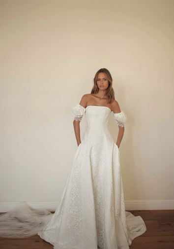 اصبحت موضة تصاميم فساتين الزفاف المصممة بأكمام منفصلة من الاتجاهات البارزة بقوة في 2024، وقد رصدناه في أكثر من مجموعة، ولكننا أحببنا الفستان الديكولتيه المغلف بالكامل بالدانتيل المورد والمزود بجيوب على جانبي التنورة من مجموعة ماركة ليهي هود Lihi Hod، نسقيه مع قلادة قصيرة ناعمة من الذهب الأبيض المرصع بالألماس، وارتدي أقراطاً متدلية قصيرة، وتممي اللوك بحذاء مدبب أبيض سادة.