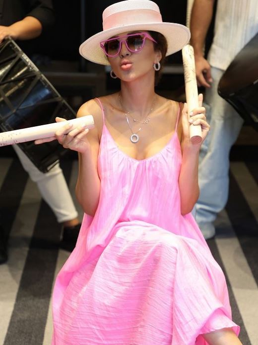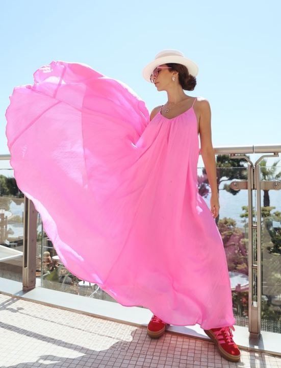وتألقت ميريام فارس بإطلالة صيفية عصرية، حيث ارتدت فستان طويل فضفاض، بدون أكمام، صمم من قماش ناعم باللون البينك الفاتح لتشبه الزهرة في بستان الزهور.