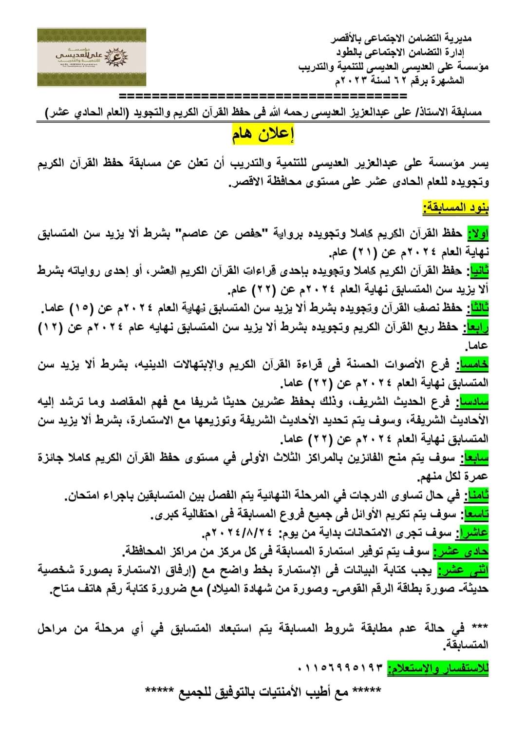 أعلنت مؤسسة علي العديسي للتنمية عن شروط وخطوات المشاركة بأكبر مسابقة دينية تشهدها محافظة الأقصر كل عام، لحفظة القرآن الكريم؛ وذلك في موسمها الحادي عشر.