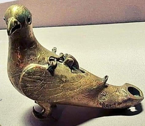 المتحف القبطي بمصر القديمة: يعرض مسرجة من البرونز من العصر البيزنطي، على شكل "الحمامة" التي ترمز إلى السلام وبها سلسلة للتعليق.