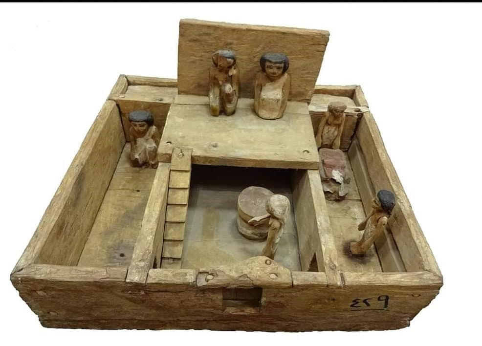 متحف ملوي بالمنيا: يعرض تمثال من عصر الانتقال الأول لسيدة تقوم بطحن بذور الشعير داخل إناء يخرج منه عصا طويل.