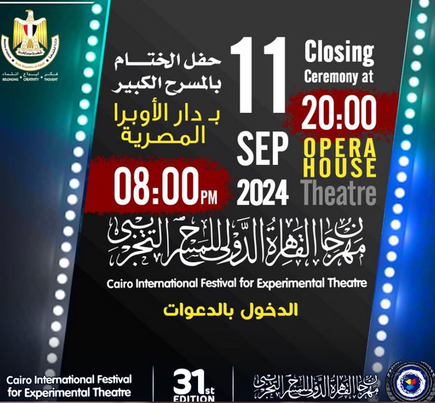 يختتم مهرجان القاهرة الدولى للمسرح التجريبي دورته الحادية والثلاثين برئاسة الدكتور سامح مهران، اليوم الأربعاء على المسرح الكبير بدار الأوبرا المصرية، وسيبدأ الحفل فيلم قصير بعنوان "هنا التجريبي"، فكرة وإخراج محمد فاضل القباني، ثم فقرة فنية إخراج وليد عوني.