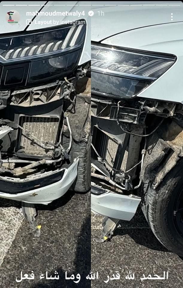 ونشر لاعب الاتحاد السكندري، عبر خاصية الاستوري علي حسابه الخاص بانستجرام صورة لسيارته المتضررة من حادث السير، وعلق عليها قائلًا: "الحمد لله قدر الله وما شاء فعل".