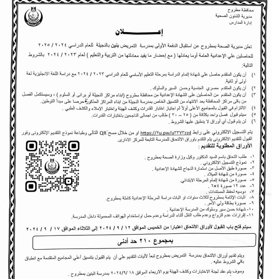 _ أن يكون المتقدم من الحاصلين على الشهادة الإعدادية من محافظة مطروح ابناء مراكز النجيلة أو براني أو السلوم ) ، وسيستكمل الفصل من باقي مراكز المحافظة بعد الانتهاء من التنسيق الخاص بمدرسة النجيلة من ابناء المراكز المذكورة حرصا على مبدأ التوطين.