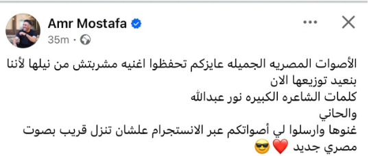 وكتب عمرو مصطفى، عبر صفحته قائلًا : "الأصوات المصرية الجميلة، عايزكم تحفظوا أغنية (مشربتش من نيلها) لأننا بنعيد توزيعها الآن، كلمات الشاعرة الكبيرة نور عبدالله وألحاني، غنوها وارسلوا لي أصواتكم عبر الانستجرام، علشان تنزل قريب بصوت مصري جديد".