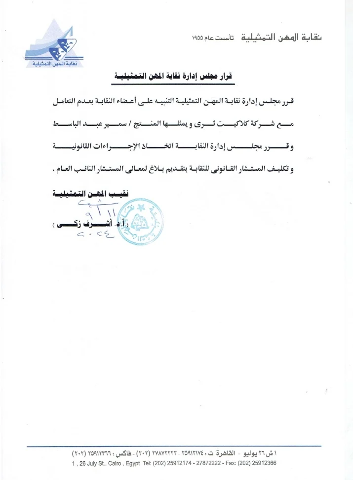أصدرت نقابة المهن التمثيلية برئاسة الفنان الدكتور أشرف زكي بيانا، أعلنت من خلاله عدم التعامل مع شركة كلاكيت ثرى ويمثلها المنتج سمير عبد الباسط، واتخاذ الإجراءات القانونية ضده.