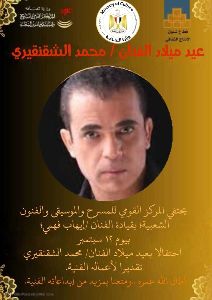 ويأتي احتفال المركز القومي للمسرح بعيد ميلاد الفنان محمد الشقنقيري، تقديرًا لأعماله الفنية.