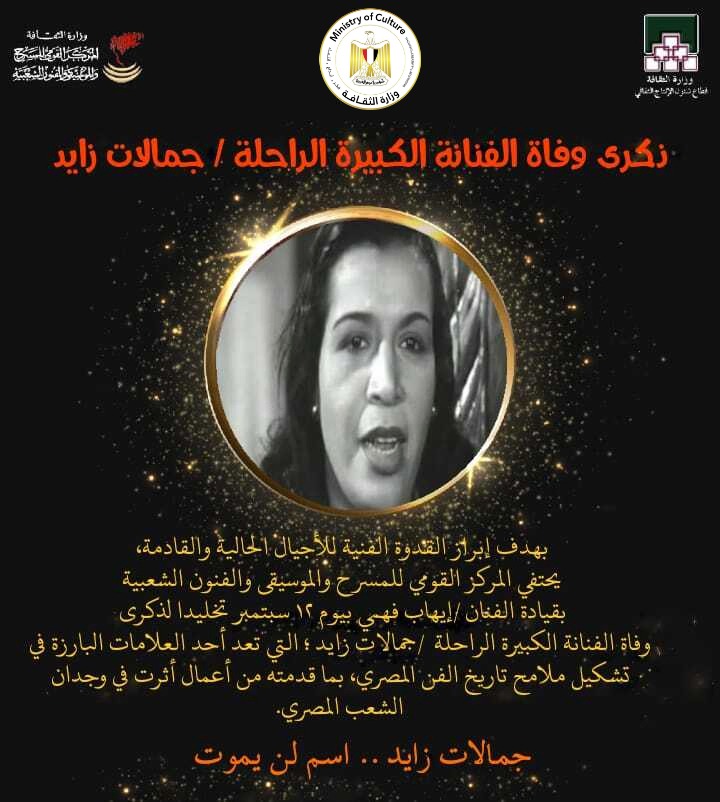 أحيا المركز القومي للمسرح والموسيقى والفنون الشعبية برئاسة الفنان إيهاب فهمي، اليوم، الخميس، ذكرى وفاة الفنانة جمالات زايد.