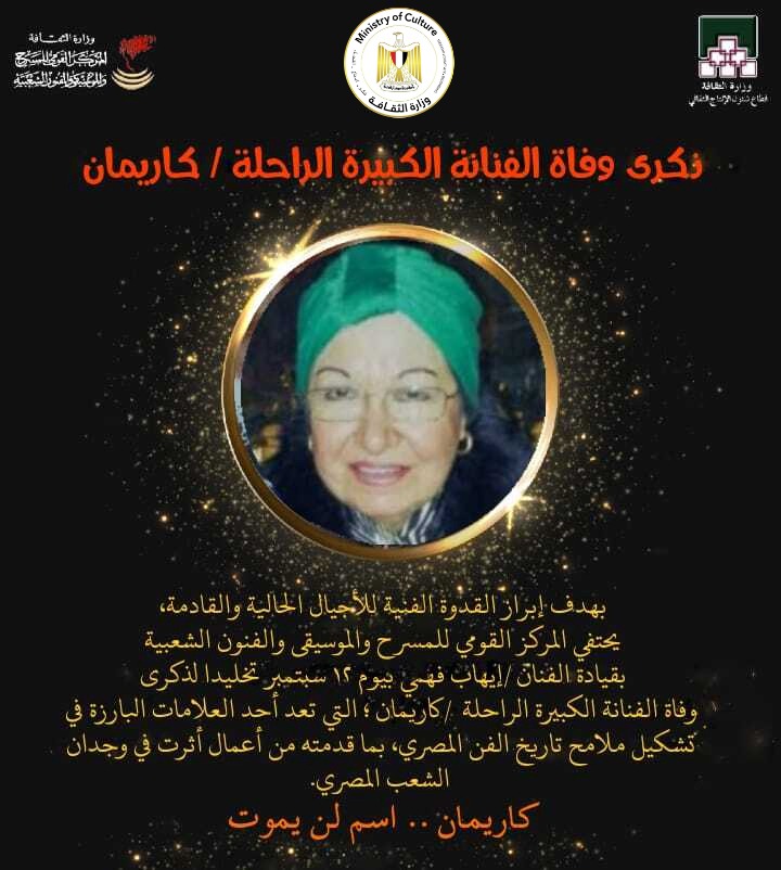 أحيا المركز القومي للمسرح والموسيقى والفنون الشعبية برئاسة الفنان إيهاب فهمي، اليوم، الخميس، ذكرى وفاة الفنانة كريمان.