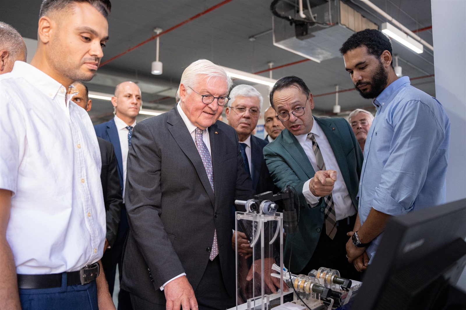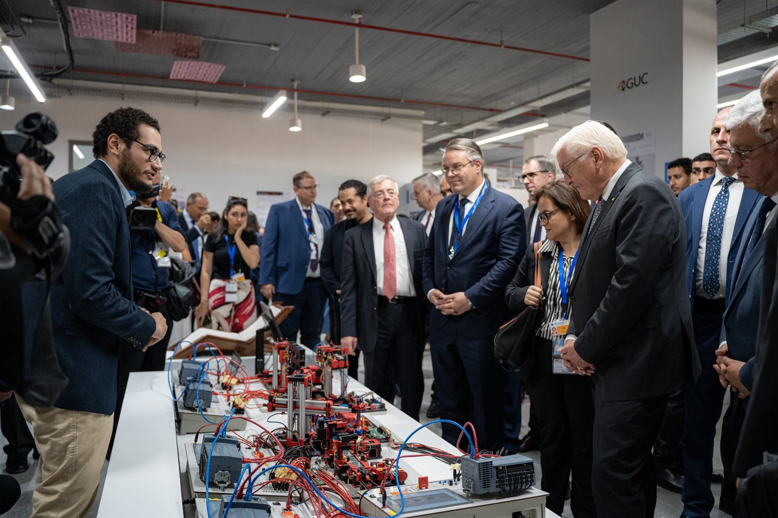 رافق الرئيس الألمانى خلال الزيارة الدكتور أيمن عاشور، وزير التعليم العالي والبحث العلمي، والدكتور أشرف منصور، الرئيس المؤسس للجامعة الألمانية بالقاهرة GUC ورئيس مجلس الأمناء المشارك للجامعة الألمانية الدولية GIU والدكتور جورج لوى، رئيس مجلس أمناء الجامعة الألمانية الدولية، وعدد من الدبلوماسيين والأكاديميين والشخصيات العامة والإعلاميين.
