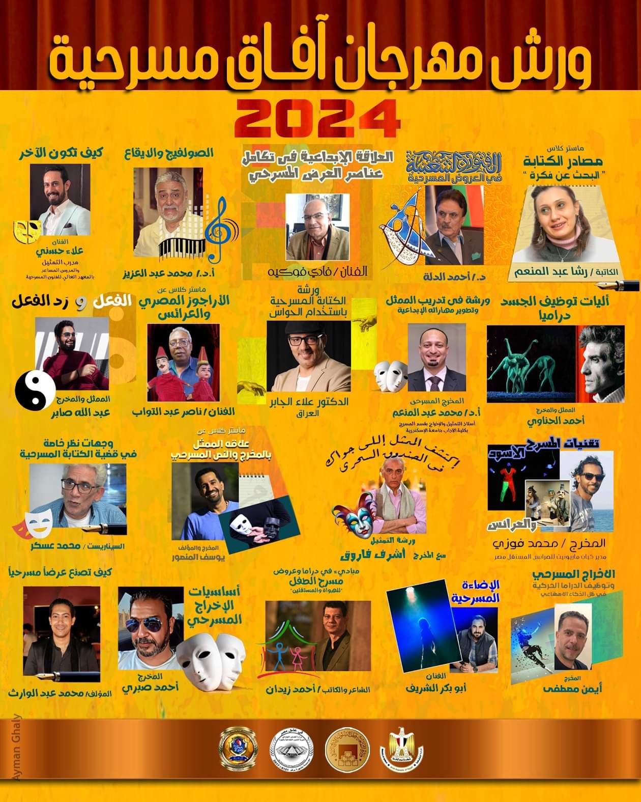 ويدرب في ورش مهرجان آفاق مسرحية نخبة من مبدعي المسرح الحر والمستقل في شتى مجالات العرض المسرحي، وهم : "الكاتب علاء الجابر - ورشة الكتابة المسرحية باستخدام الحواس، الفنان فادي فوكيه - العلاقة الإبداعية في تكامل عناصر العرض المسرحي، المخرج أشرف فاروق - الصندوق السحري، الكاتبة رشا عبد المنعم - ماستر كلاس "مصادر الكتابة / البحث عن فكرة"، المخرج والمؤلف يوسف المنصور - ماستر كلاس "علاقه الممثل بالمخرج والنص المسرحي"، المخرج محمد فوزي - تقنيات المسرح الأسود والعرائس - كيان ماريونيت، المخرج أيمن مصطفى - الاخراج المسرحي وتوظيف الدراما الحركية في ظل الذكاء الاصطناعي، الشاعر والكاتب أحمد زيدان - مباديء في دراما وعروض مسرح الطفل "للهواة والمستقلين"، الفنان ناصر عبد التواب - ماستر كلاس "الأراجوز المصري والعرائس"، السيناريست محمد عسكر - وجهات نظر خاصة في قضية الكتابة المسرحية، الممثل والمخرج عبد الله صابر - الفعل ورد الفعل، الفنان ومدرب التمثيل علاء حسني - كيف تكون الآخر، الممثل والمخرج أحمد الحناوي - أليات توظيف الجسد دراميا، المؤلف محمد عبد الوارث - كيف تصنع عرضاً مسرحياً، د. أحمد الدلة - الفنون الشعبية في العروض المسرحية، لفنان أبو بكر الشريف - الإضاءة المسرحية، المخرج أحمد صبري - أساسيات الإخراج المسرحي، أ.د. محمد عبد العزيز - الصولفيج والايقاع، المخرج المسرحي أ.د محمد عبد المنعم - ورشة فى تدريب الممثل وتطوير مهاراته الإبداعية".