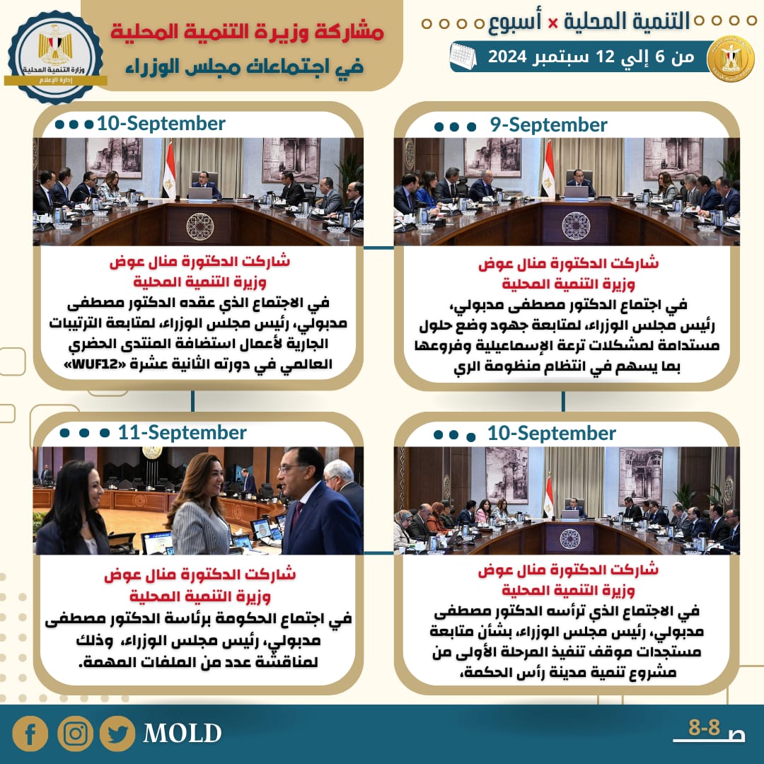 كما شاركت الدكتورة منال عوض وزيرة التنمية المحلية، في الاجتماع الذي ترأسه الدكتور مصطفى مدبولي، رئيس مجلس الوزراء، بشأن متابعة مستجدات موقف تنفيذ المرحلة الأولى من مشروع تنمية مدينة رأس الحكمة، وكذا التعويضات المقررة للمستحقين من أهالي المنطقة.