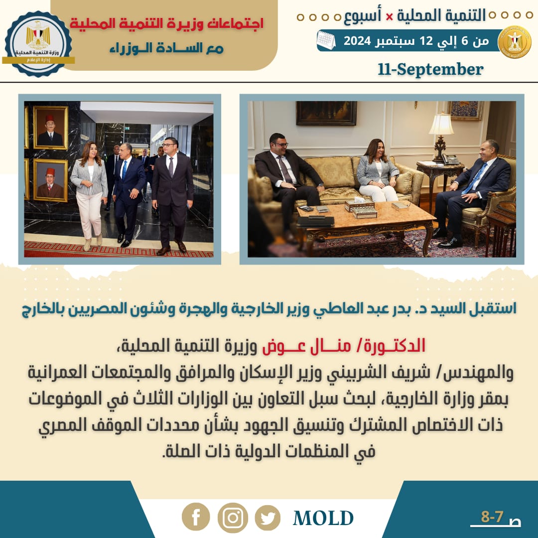كما استقبل السيد د. بدر عبد العاطي وزير الخارجية والهجرة وشئون المصريين بالخارج، السيدة الدكتورة/ منال عوض ميخائيل وزيرة التنمية المحلية والسيد المهندس/ شريف الشربيني وزير الإسكان والمرافق والمجتمعات العمرانية بمقر وزارة الخارجية، لبحث التعاون بين الوزارات الثلاث في الموضوعات ذات الاختصاص المشترك وتنسيق الجهود بشأن محددات الموقف المصري في المنظمات الدولية ذات الصلة، ومن ضمنها التعاون مع برنامج الأمم المتحدة للمستوطنات البشرية UN-Habitat، ولاسيما في مجالي التخطيط الحضري، وبناء المدن والمجتمعات الشاملة والآمنة والمرنة والمستدامة.