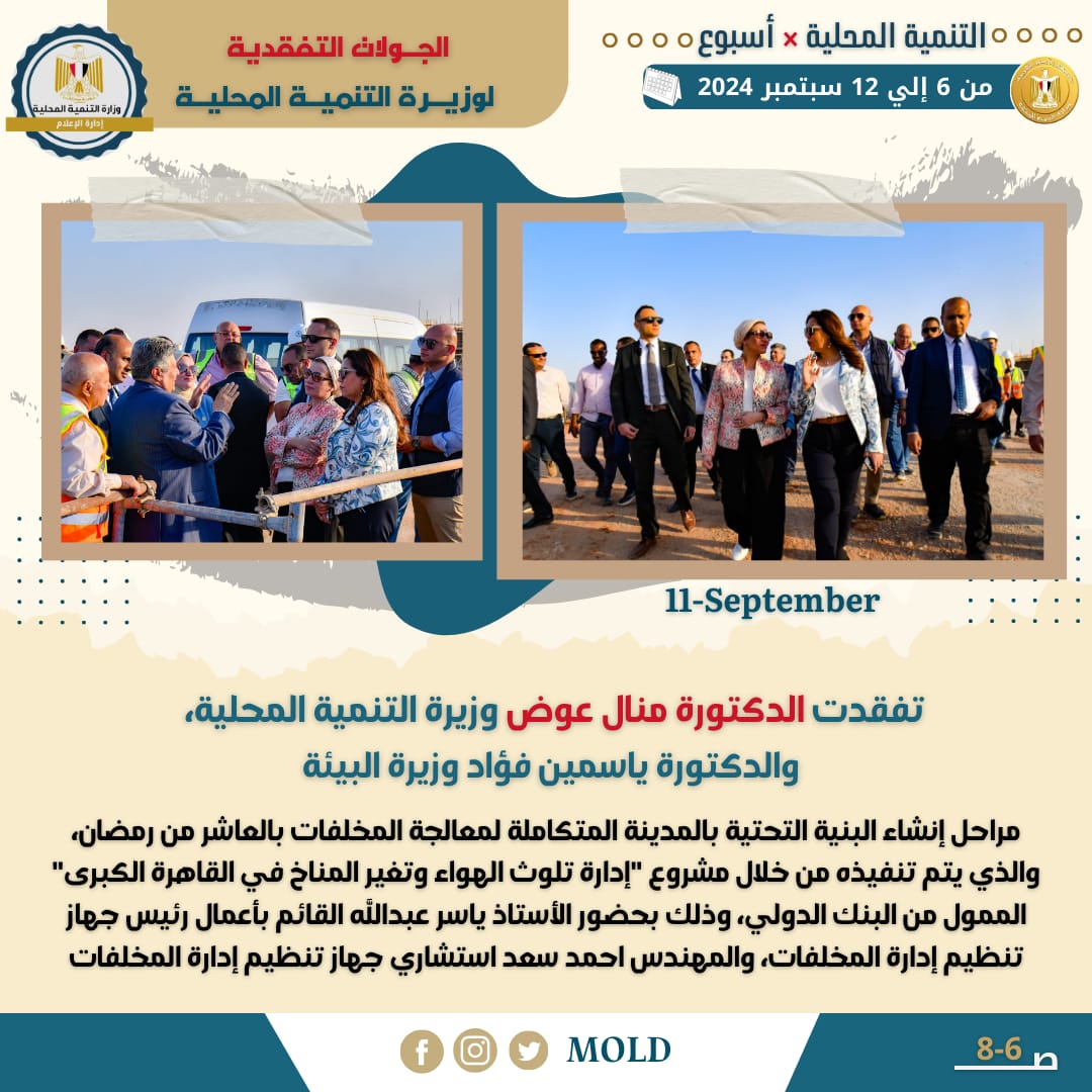 تفقدت الدكتورة منال عوض وزيرة التنمية المحلية والدكتورة ياسمين فؤاد وزيرة البيئة، مراحل إنشاء البنية التحتية بالمدينة المتكاملة لمعالجة المخلفات بالعاشر من رمضان، والذي يتم تنفيذه من خلال مشروع "إدارة تلوث الهواء وتغير المناخ في القاهرة الكبرى" الممول من البنك الدولي، وذلك بحضور عدد من قيادات الوزارتين .