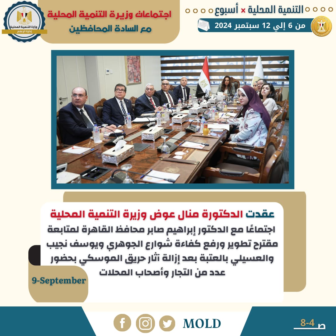 وعقدت الدكتورة منال عوض وزيرة التنمية المحلية ، اجتماعاً مع الدكتور إبراهيم صابر محافظ القاهرة وبحضور اللواء إبراهيم عبدالهادي نائب المحافظ للمنطقة الغربية وعدد من قيادات الوزارة والمحافظة وممثلين عن برنامج الأمم المتحدة للمستوطنات البشرية" الهابيتات" وعدد من التجار وأصحاب المحلات التجارية بمنطقة العتبة .
