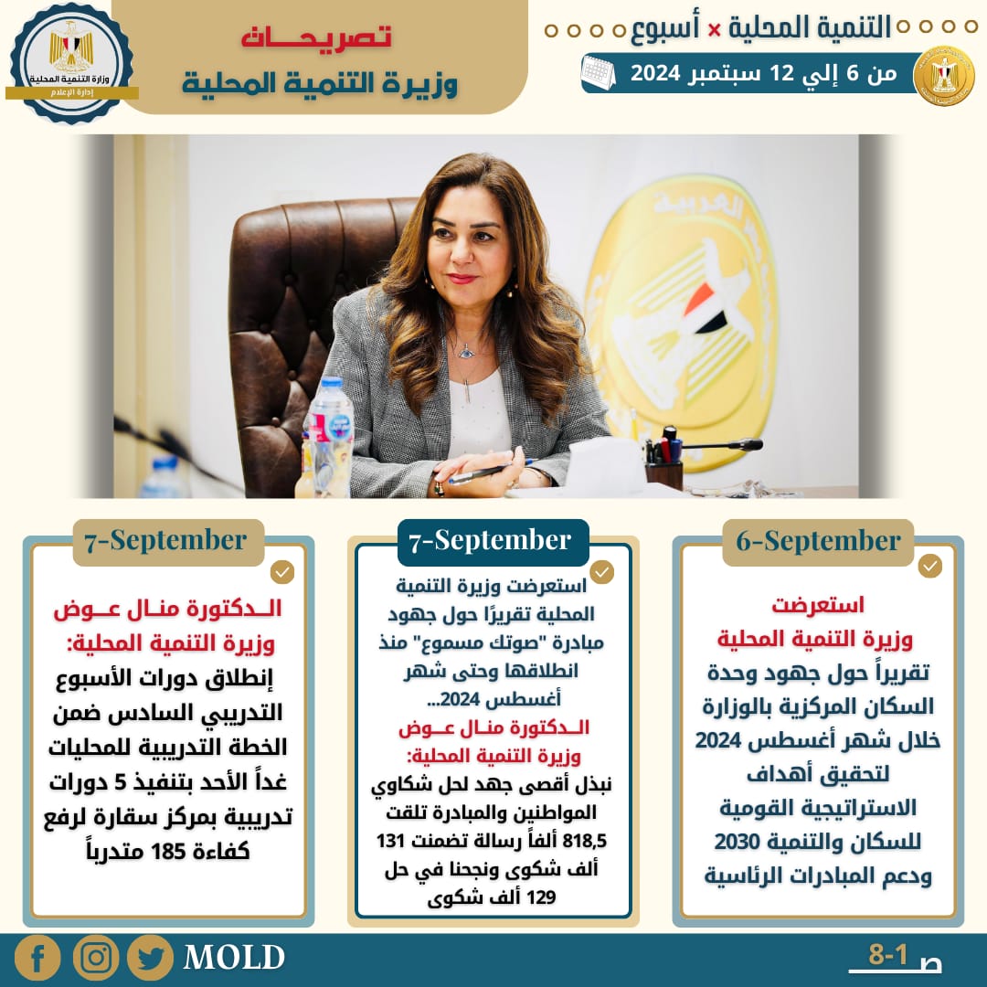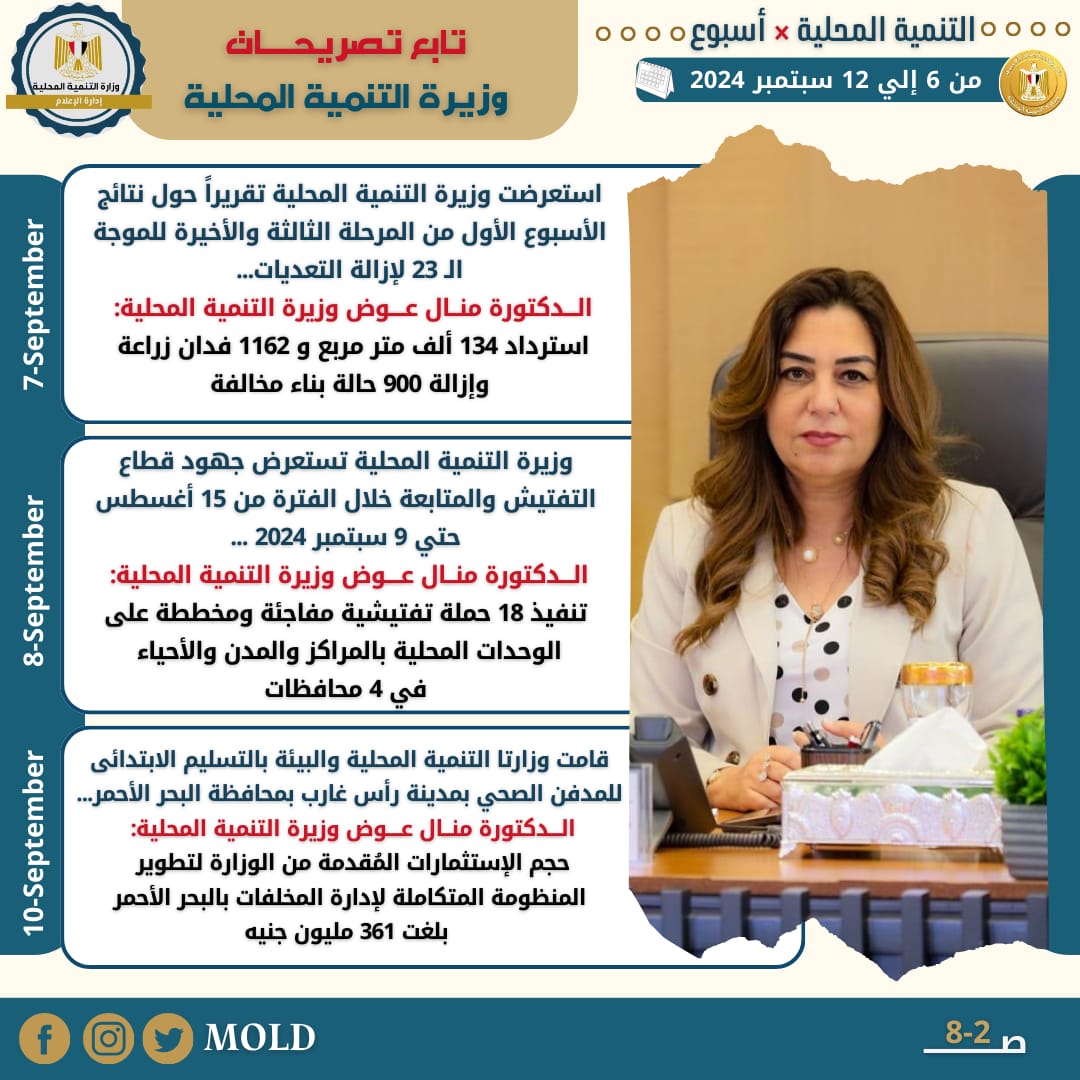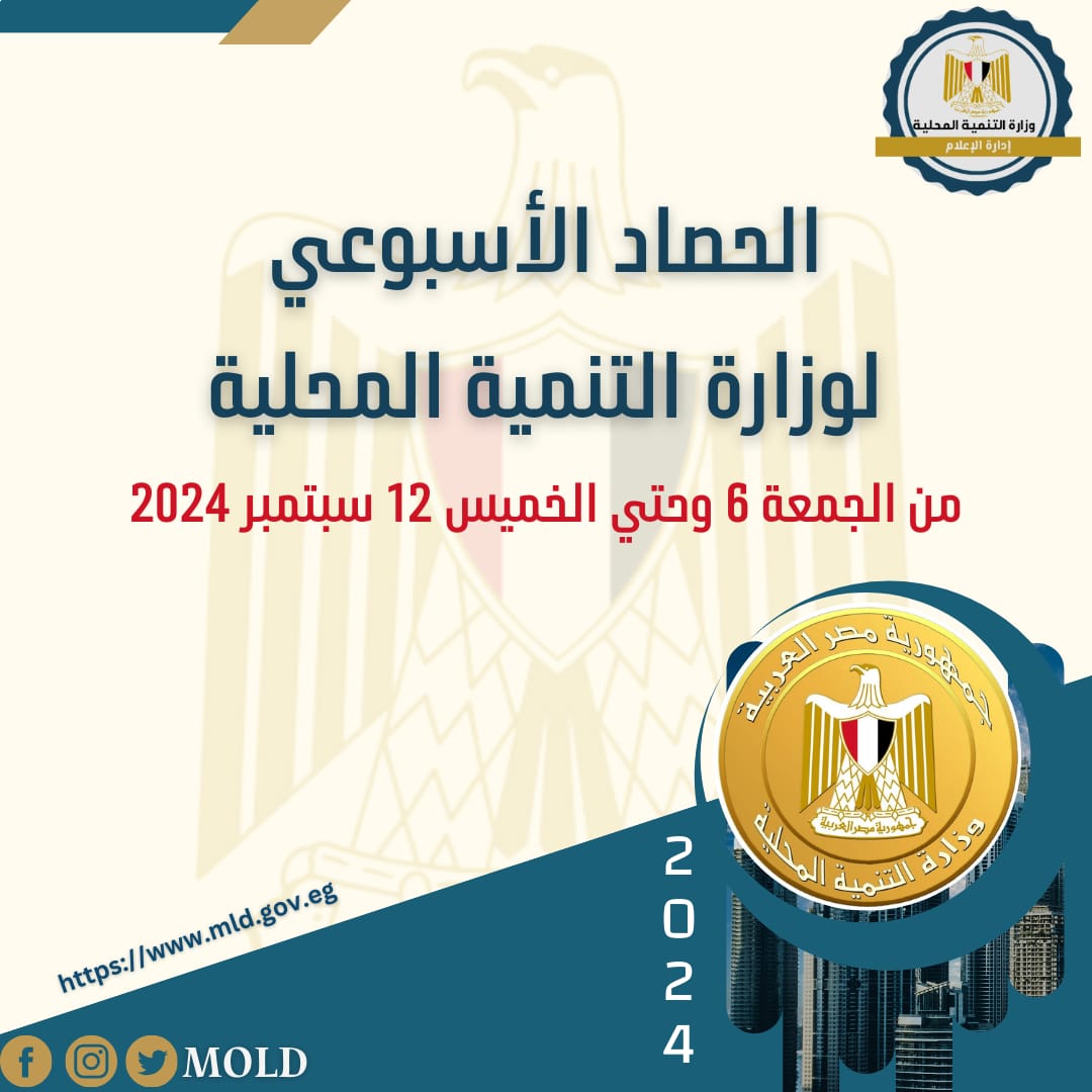 أصدر المركز الإعلامي التابع لوزارة التنمية المحلية، "الإنفوجراف الأسبوعي" في نسخته الـ 101 حول حصاد أهم الأنشطة والفعاليات التي قامت بها الدكتورة منال عوض وزيرة التنمية المحلية، خلال الفترة من يوم الجمعة 6 سبتمبر وحتى الخميس 12 سبتمبر الجاري 2024، حيث نستعرض أبرزها في التقرير التالي الذي نشرته الصفحة الرسمية لوزارة التنمية المحلية على موقع التواصل الاجتماعي "فيس بوك" من خلال انفوجراف يرصد أبرز تلك الأنشطة التي جاءت كالتالي: