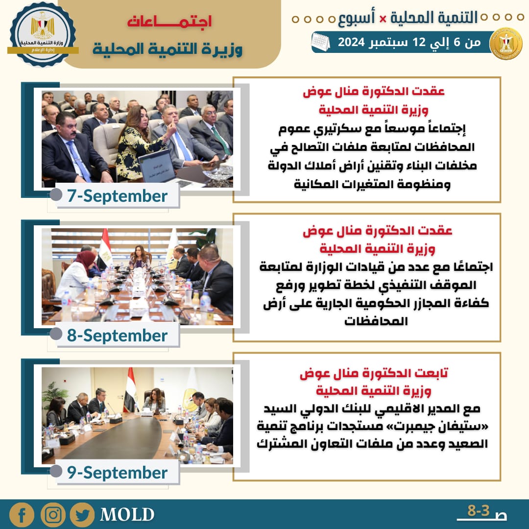كما عقدت الدكتورة منال عوض وزيرة التنمية المحلية ، إجتماعاً موسعاً مع سكرتيري عموم المحافظات وذلك بمقر وزارة التنمية المحلية بالعاصمة الإدارية الجديدة وذلك بحضور عدد من قيادات الوزارة ومسئولي ملف التصالح على مخالفات البناء بالمحافظات، واستعرضت وزيرة التنمية المحلية بعض الملفات المهمة علي رأس أولويات عمل الوزارة ومن بينها ملفات التصالح في مخلفات البناء وتقنين أراض أملاك الدولة ومنظومة المتغيرات المكانية وإزالة التعديات علي أملاك وأراضي الدولة والأراضي الزراعية.