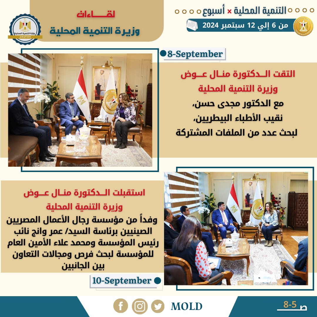 واستقبلت الدكتورة منال عوض وزيرة التنمية المحلية، وفداً من مؤسسة رجال الأعمال المصريين الصينيين برئاسة السيد/ عمر وانج نائب رئيس المؤسسة ومحمد علاء الأمين العام للمؤسسة لبحث فرص ومجالات التعاون بين الجانبين وذلك بحضور عدد من قيادات الوزارة.