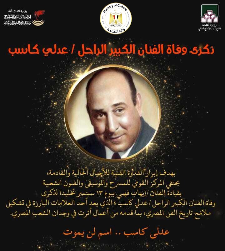 أحيا المركز القومي للمسرح والموسيقى والفنون الشعبية برئاسة الفنان إيهاب فهمي، اليوم، الجمعة، ذكرى وفاة الفنان عدلي كاسب.