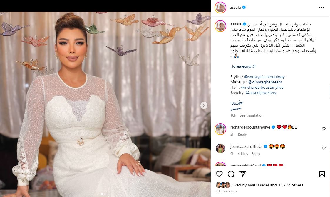 وظهرت أصالة عبر الإنستجرام بإطلالة راقية أنيقة، حيث ارتدت فستان طويل مجسم، بأكمام طويلة، صمم من قماش التل الناعم المزين بالدانتيل باللون الأبيض، يتوسطه حزام رفيع حول خصرها، لتعكس قوامها الرشيق ووزنها المثالي.