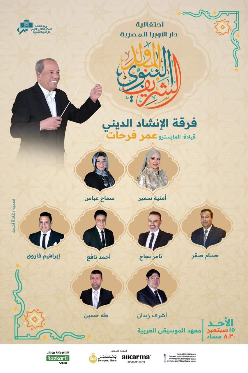 ضمن توجهات الثقافة المصرية لإعلاء القيم الإنسانية و الإحتفال بالمناسبات الدينية تنظم دار الأوبرا المصرية برئاسة الدكتورة لمياء زايد أحتفالية فنية بمناسبة الذكرى العطرة للمولد النبوى الشريف تحييها فرقة الإنشاد الديني بقيادة المايسترو عمر فرحات وذلك فى الثامنة و النصف مساء الاحد ١٥ سبتمبر على مسرح معهد الموسيقى العربية .