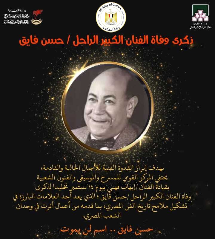 أحيا المركز القومي للمسرح والموسيقى والفنون الشعبية برئاسة الفنان إيهاب فهمي، اليوم، السبت، ذكرى وفاة الفنان حسن فايق.
