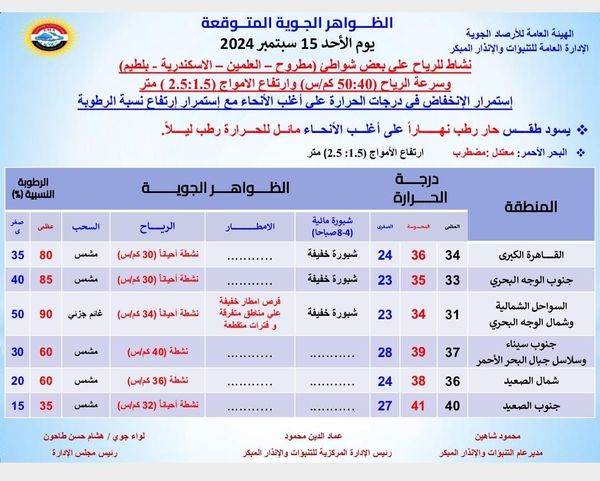 وقالت الهيئة عبر صفحتها على مواقع التواصل الاجتماعى، أنه من المتوقع أن تشهد البلاد بداية من اليوم السبت 14 سبتمبر وحتى الخميس 19 سبتمبر انخفاض في درجات الحرارة بقيم تتراوح ما بين 3:2 درجة على معظم الأنحاء مع ارتفاع نسبة الرطوبة.