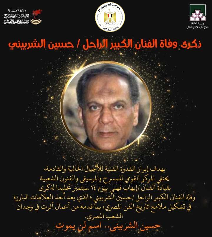أحيا المركز القومي للمسرح والموسيقى والفنون الشعبية برئاسة الفنان إيهاب فهمي، اليوم، السبت، ذكرى وفاة الفنان حسين الشربيني.