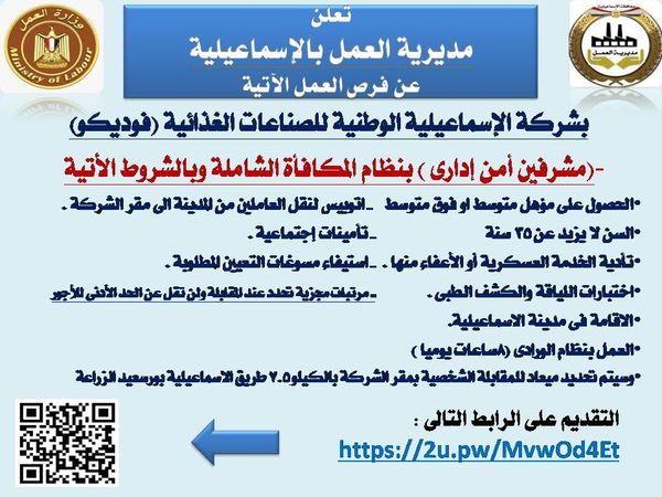 أعلنت مديرية العمل بمحافظة الإسماعيلية عن توفير عدد من فرص العمل للشباب من أبناء المحافظة والمقيمين فيها، وذلك بالتنسيق والتعاون مع شركة الاسماعيلية الوطنية للصناعات الغذائية (فوديكو)، للعمل داخل الشركة على وظيفة مشرفين أمن إدارى بنظام المكافأة الشاملة.