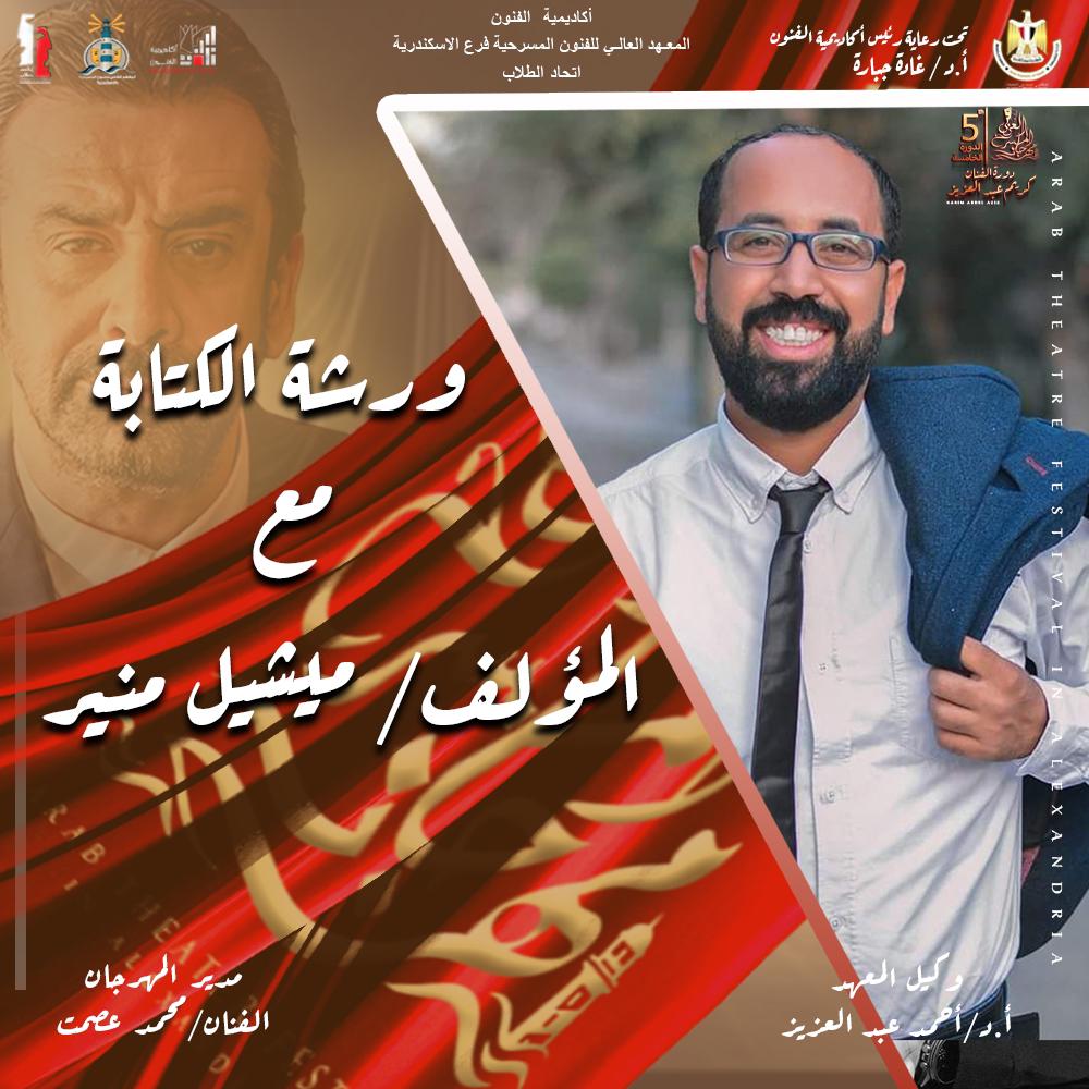 أعلن الفنان محمد عصمت، مدير مهرجان المسرح العربي، عن رابع ورش الدورة الخامسة، وهي ورشة الكتابة، والتي يقدمها المؤلف ميشيل منير، وتحمل هذه الدورة من المهرجان اسم الفنان كريم عبد العزيز، وهو المهرجان التابع لأكاديمية الفنون والمعهد العالي للفنون المسرحية فرع الإسكندرية، تحت رعاية الدكتورة غادة جبارة رئيس أكاديميةالفنون واشراف الدكتور أحمد عبد العزيز وكيل المعهد العالي للفنون المسرحية بالإسكندرية.