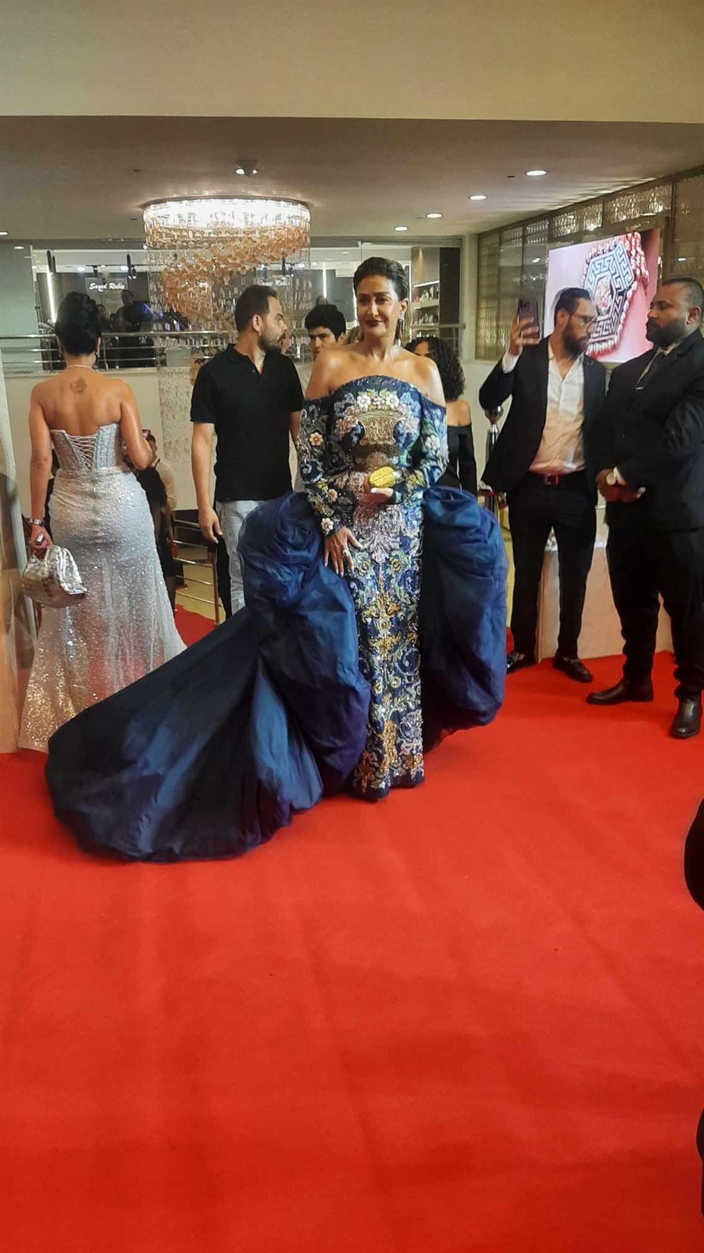 وبالطبع كعادتها خطفت الفنانة غادة عبد الرازق الأضواء وعدسات المصورين بإطلالتها حيث تألقت  الفنانة البالغة من العمر الـ 54 عام بإطلالة أنيقة ومختلفة حيث ارتدت فستان عاري الكتفين وبأكمام طويلة ويتميز بقصة مجسمة تبرز قوامها الرشيق ، ويتميز الفستان بإكستنشن "منفوش" باللون الأزرق الطاغي على فستانها ذو النقوشات الملونة .