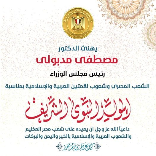 رئيس الوزراء يُهنئ الشعب المصري والأمتين العربية والإسلامية بالمولد النبوي