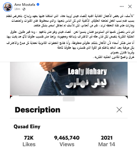 أغنية ليلي نهاري دون ذكر إسم عمرو مصطفى كملحن، ويعلق قائلًا: خرق واضح للقانون الملكيه الفكريه .