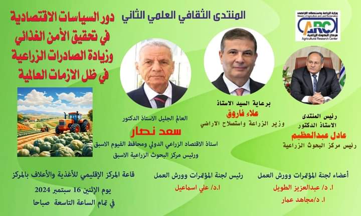 ويعقد المنتدى الثقافي العلمي الثاني لمركز البحوث الزراعية الذي تنظمه لجنة المؤتمرات وورش العمل والندوات بالمركز الإقليمي للأغذية والأعلاف تحت عنوان " دور السياسات الاقتصادية في تحقيق الأمن الغذائي وزيادة الصادرات الزراعية في ظل الازمات العالمية" ويستضيف الدكتور سعد نصار استاذ الاقتصاد الزراعي بجامعة القاهرة ومحافظ الفيوم الاسبق ورئيس مركز البحوث الزراعية الأسبق.