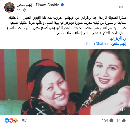 نشرت الفنانة إلهام شاهين فيديو مؤثر لوالدتها مصنوع من الذكاء الاصطناعي بواسطة إحدى المعجبات عبر موقع التواصل الاجتماعي الشهير “فيسبوك”.