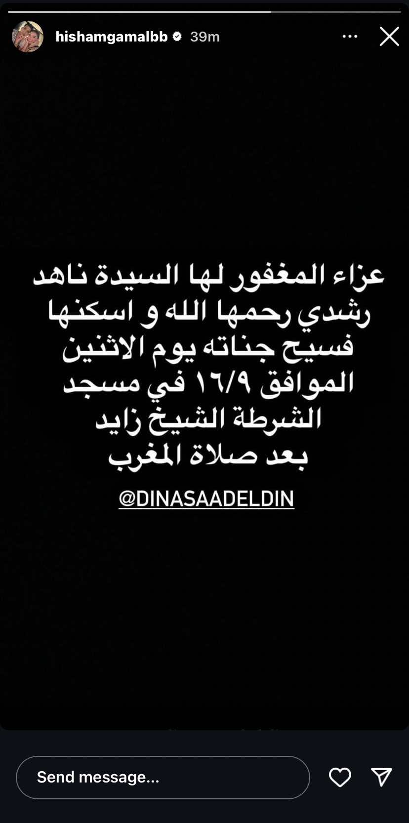 وكتب هشام جمال: "عزاء المغفور لها السيدة ناهد رشدي رحمها الله وأسكنها فسيح جناته، يوم الأثنين الموافق 16-9 في مسجد الشرطة الشيخ زايد بعد صلة المغرب"، مشيرًا إلى حساب ابنتها "دينا سعد" الشخصي على موقع انستجرام.