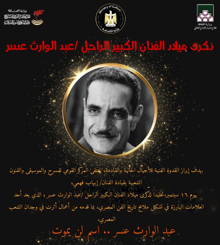 أحيا المركز القومي للمسرح والموسيقى والفنون الشعبية برئاسة الفنان إيهاب فهمي، اليوم، الاثنين، ذكرى ميلاد الفنان عبدالوارث عسر.