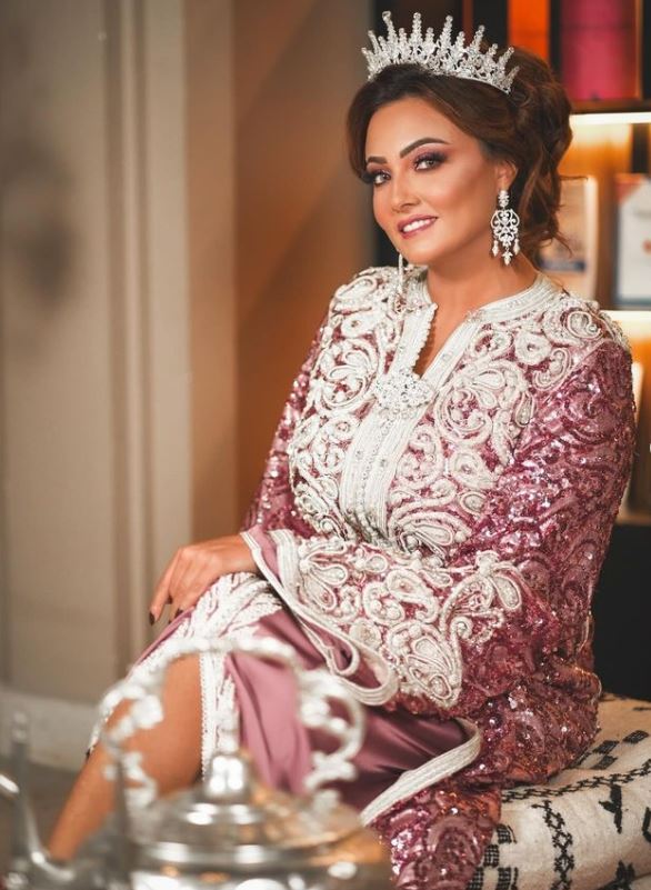 وبدت بشرى بإطلالة ملكية، حيث ارتدت قفطانا مغربيا مطرزا بخيوط الحرير باللون الأبيض من الأمام، صمم من قماش البايت مع الساتان باللون الوردي وحمل توقيع مصممة الأزياء وفاء.