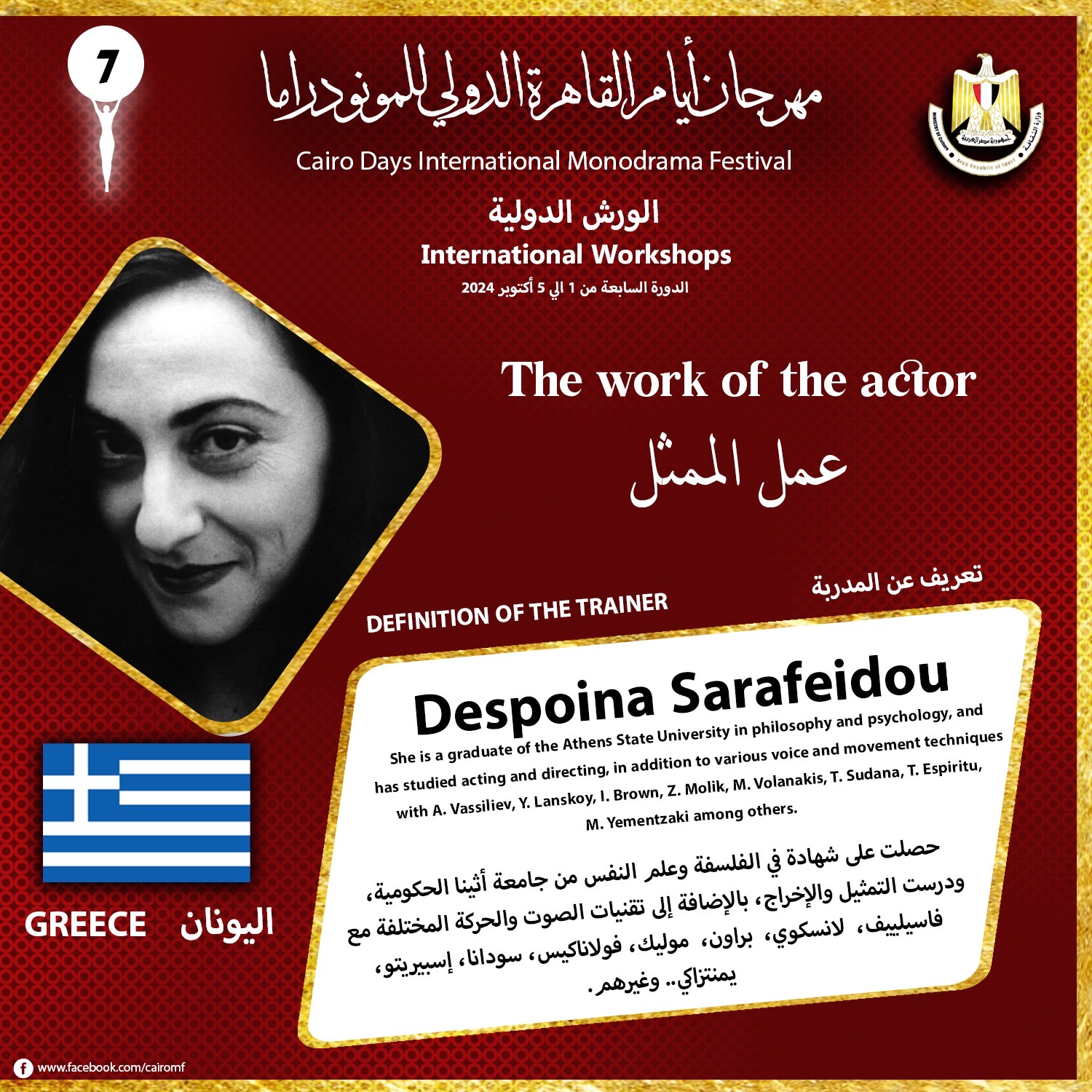 وأوضح المخرج أسامة رؤوف مؤسس ورئيس مهرجان أيام القاهرة الدولي للمونودراما أن فعاليات الدورة السابعة من المهرجان التى تقام في الفترة من 1 حتى 5 أكتوبر المقبل، تتضمن ورشة بعنوان "عمل الممثل" لليونانية المخرجة Despoina Sarafeidou، وورشة بعنوان " الممثل ولغة الجسد" للمخرج الأسبانى José Antonio Lucia، وورشة التأليف  للمونودراما بعنوان " فن كتابة الأنا والأخر" للكاتبة والناقدة صفاء البيلى.