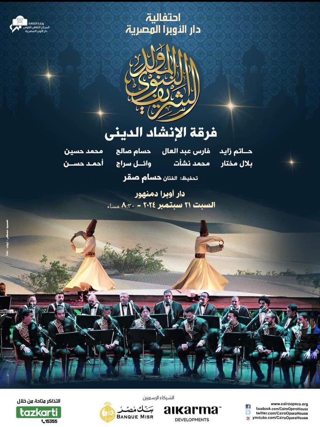 تنظم دار الأوبرا برئاسة الدكتورة لمياء زايد، إحياءً لذكرى المولد النبوي الشريف احتفالية لفرقة الإنشاد الديني، وذلك في الثامنة والنصف مساء يومي الخميس ١٩ سبتمبر على مسرح أوبرا الإسكندرية والسبت ٢١ سبتمبر على مسرح أوبرا دمنهور، في إطار فعاليات الثقافة المصرية للإحتفال بالمناسبات الدينية المختلفة.