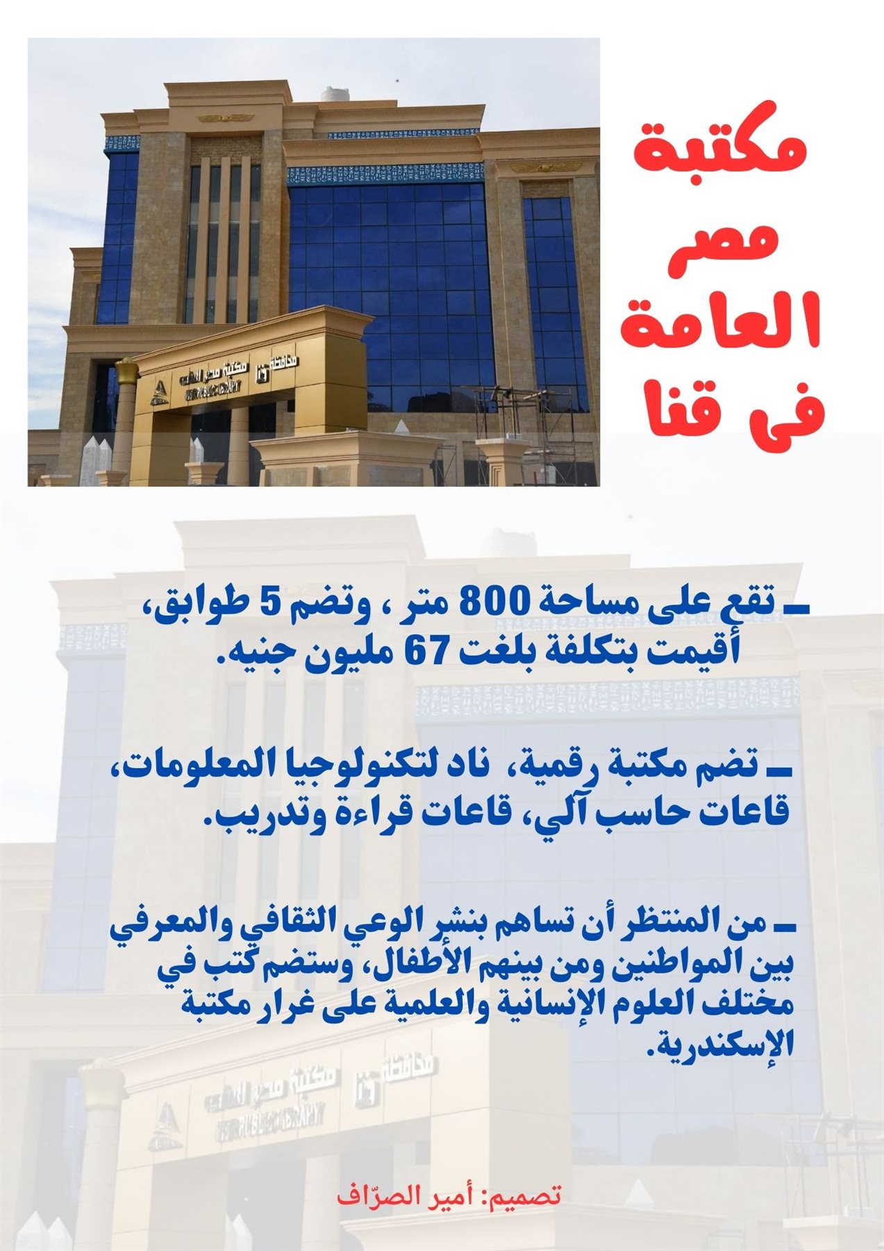 قال الدكتور خالد عبد الحليم محافظ قنا، إنه سيعاد تشكيل مجلس أمناء مكتبة مصر العامة فى قنا، وتخفيض رسوم الاشتراك، بالإضافة إلى عمل حملة ترويجية من خلال تخصيص مساحات اعلانية بجميع الميادين الرئيسية بمدن ومراكز المحافظة، واقامة معرض سنوى للكتاب، ومنفذ لبيع الكتب الخاصة بالهيئة العامة للكتاب ودور النشر الكبيرة.