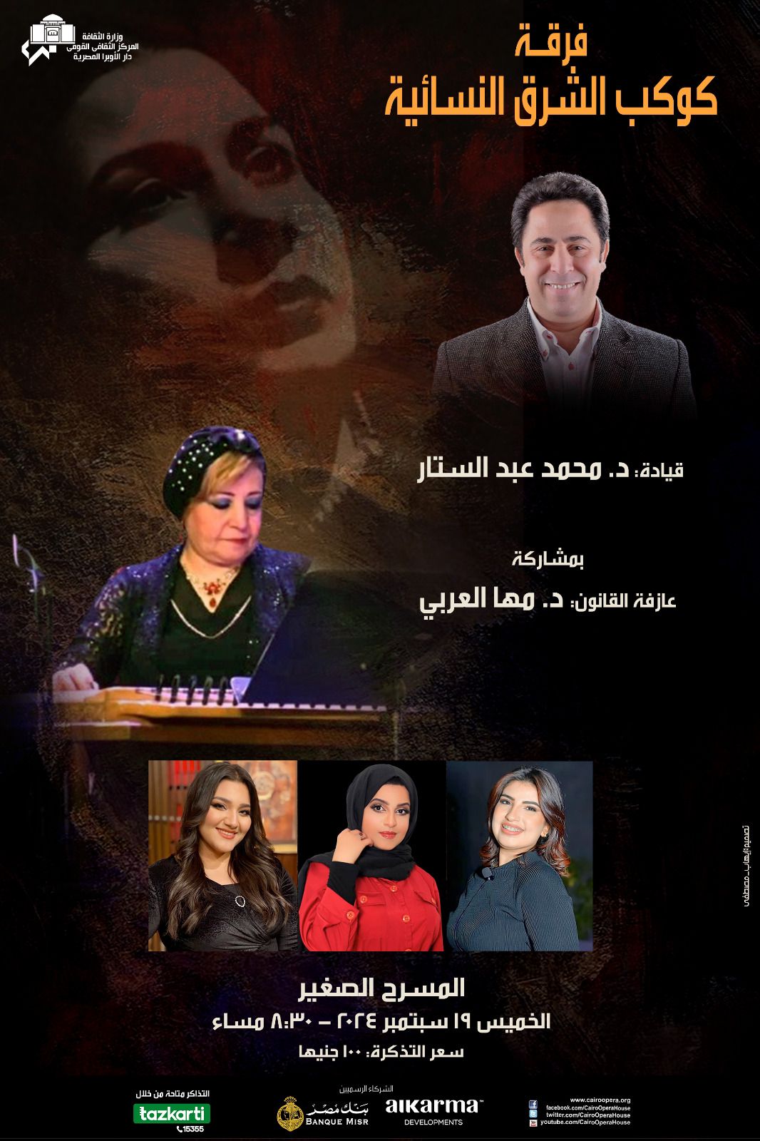 تنظم دار الأوبرا، برئاسة الدكتورة لمياء زايد، حفلًا لفرقة كوكب الشرق النسائية، بقيادة المايسترو الدكتور محمد عبدالستار، ومشاركة عازفة  القانون الدكتورة مها العربي، وإشراف فنى الدكتور عاطف إمام، وذلك فى الثامنة والنصف مساء اليوم الخميس ١٩ سبتمبر على المسرح الصغير، في إطار توجهات الثقافة المصرية الهادفة إلى نشر مختلف ألوان الفنون.