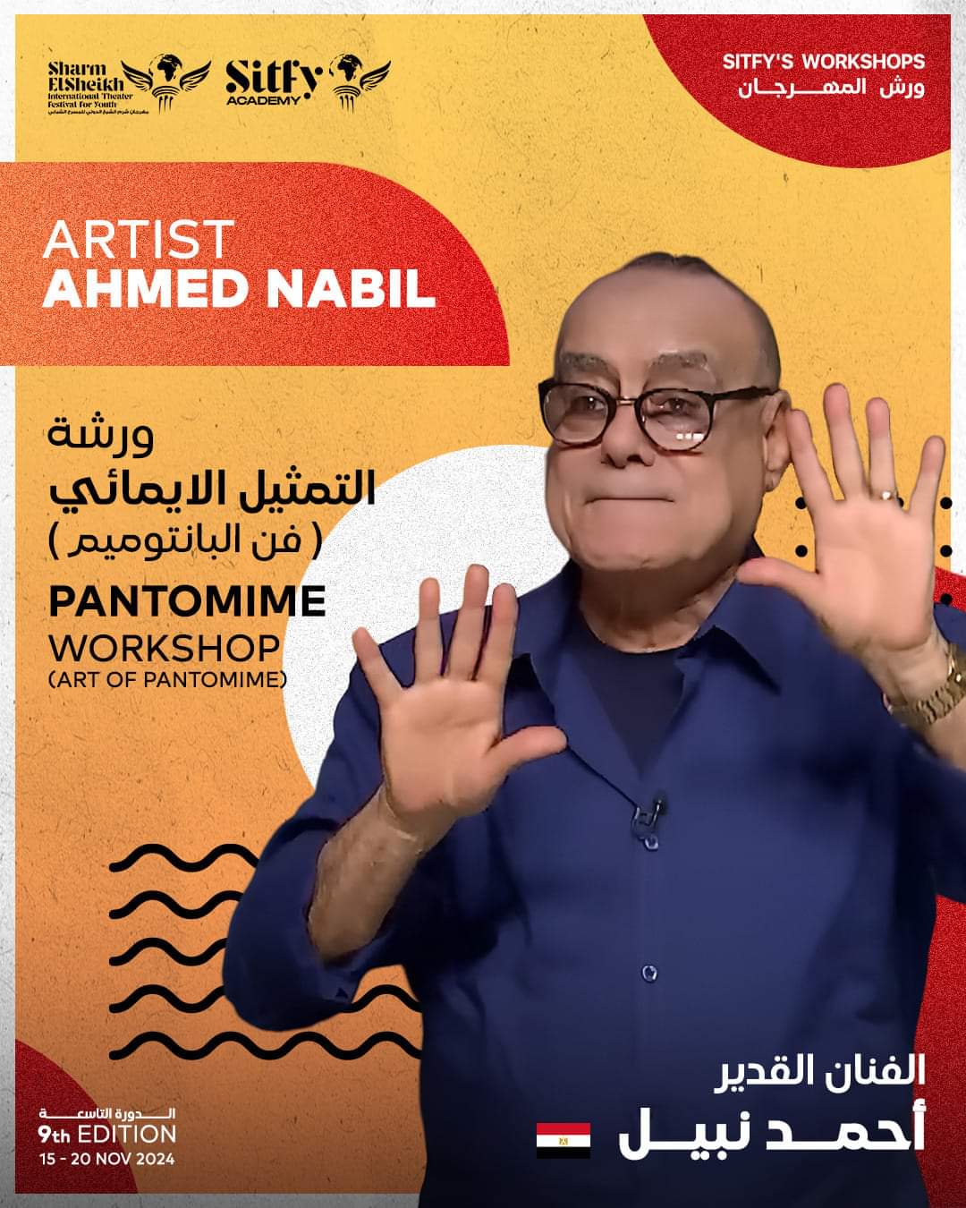 يقدم المهرجان مفاجأة هذا العام وهي ورشة في فن البانتومايم، ويقدمها رائد هذا الفن الفنان المصري العالمي أحمد نبيل، ويعود مجددا من خلال المهرجان، ليقدم ورشة " التمثيل الإيمائي" فن البانتومايم ولأول مرة في تواصل مباشر مع الشباب ، وهو رائد وأيقونة في هذا الفن، وله فيه باع طويل، فقد درس البانتومايم بالاتحاد السوفيتي السابق، وبجمهورية أذربيجان، وقدم ما يقرب من 100 عمل فني ما بين السينما والتلفزيون والمسرح، وحصل على جوائز في فن البانتومايم من الاتحاد السوفيتي، ومن جامعة جينيف واتحاد الأدباء في الهند وجامعة سيدني بأستراليا.