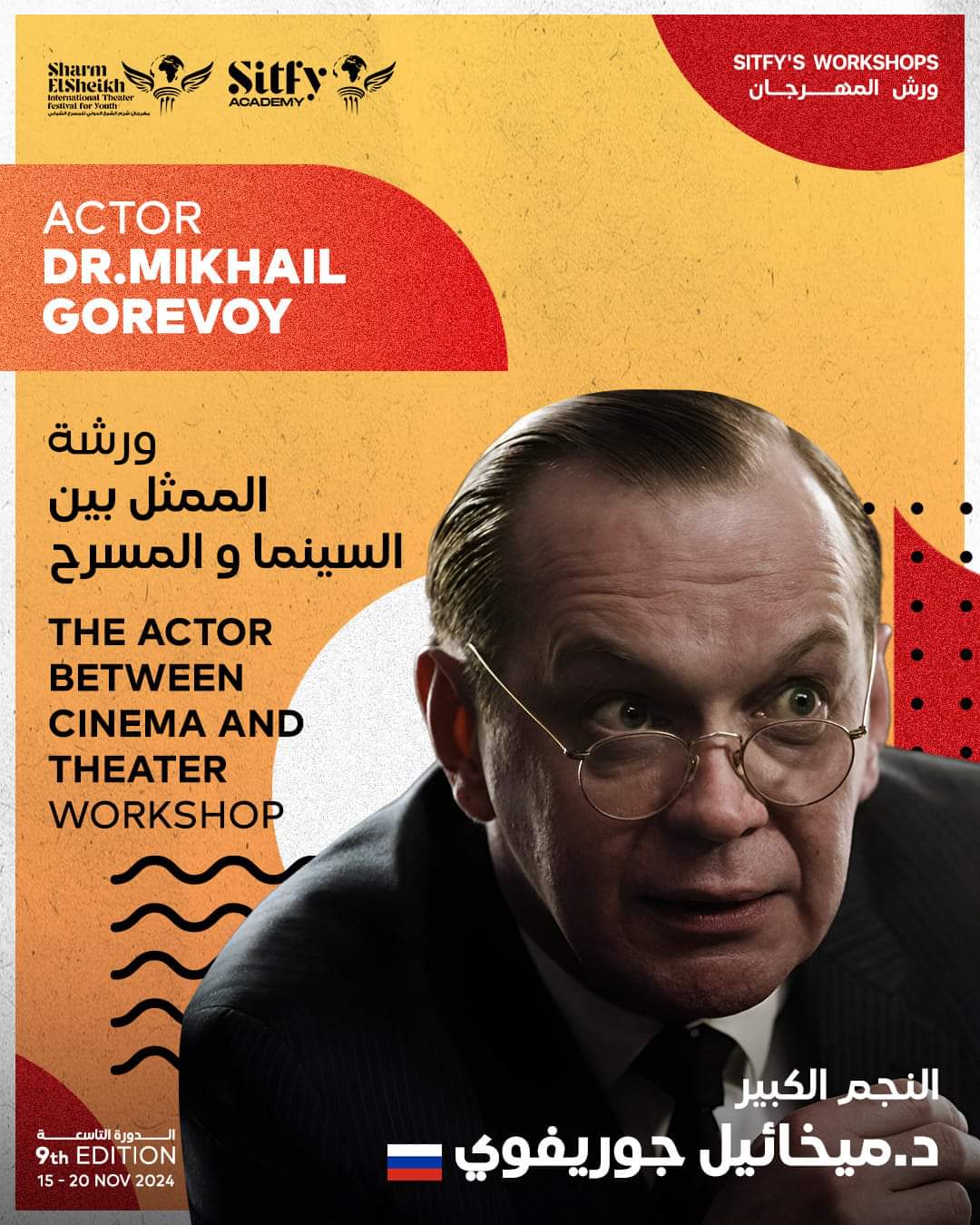 ويقدم النجم العالمي ميخائيل جوريفوي ورشة بعنوان "الممثل بين السينما والمسرح"، وهي أيضا من مفاجآت المهرجان في دورته التاسعة، فجوريفوي نجم عالمي من نجوم هوليوود، وبجانب نجوميته هو أستاذ أكاديمي في كلية الفنون بجامعة موسكو ويمتلك مسرحا خاصا وفرقة مسرحية من أهم فرق المسرح في روسيا، وقد سافر إلى الولايات المتحدة في عام 1992، حيث عاش في مدينة نيويورك وبوسطن، وعمل في وظائف مختلفة بما في ذلك تدريس طريقة ستانيسلافسكي، ثم عاد إلى روسيا في عام 1996 وأنشأ مسرحه الخاص وكرمه من قبل الرئيس الروسي فلاديمير بوتين.